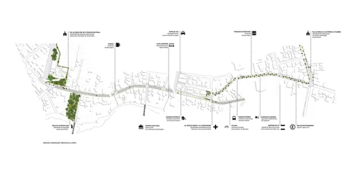 O projeto contempla a reurbanização do trecho norte - sul do eixo viário principal do município de São José, entre duas importantes igrejas históricas, e da zona central da cidade onde estão localizados os principais espaços públicos e edifícios históricos com a Igreja Matriz, Theatro Municipal, além do Parque do Beco da Carioca. A proposta se baseia em um plano macro de intervenções a longo prazo que considera reformulações no Plano Diretor e adequação às diretrizes do Estatuto da Cidade. O projeto considera a diminuição progressiva do fluxo de carros, ônibus e caminhões no núcleo histórico considerando o aumento da permeabilidade da malha viária através da construção de novas conexões; e a maior utilização da BR-101 pelos moradores locais, decorrente do desvio de trânsito decorrente da execução de alça de contorno da rodovia.