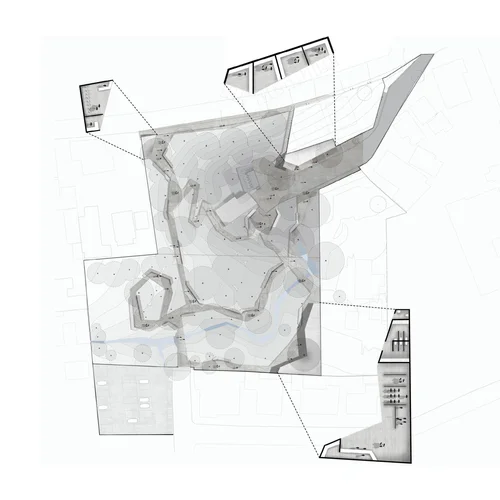 C. Conexão: Ao locar todo programa fixo na divisa com os lotes lindeiros, oportuniza-se a conexão franca com a pré-existência. Para garantir a existência de uma verdadeira galeria, eleva-se o programa sobre pilotis, gerando uma nova oportunidade de percurso que se apresenta na forma de uma praça pública e coberta, catalisando a troca e potencializando o encontro.