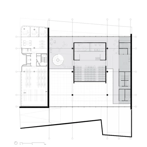 Nos pavimentos de acervo e leitura, o corpo da biblioteca, foi prevista a abertura de lajes junto à fachada nas áreas de leitura. Os vazios gerados garantem a amplitude espacial, a conectividade visual e a melhor iluminação dos pavimentos.