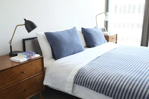 Ambas as suítes –de casal e de hóspedes- têm armários embutidos próprios do imóvel. O dormitório de visitas é utilizado como escritório na maioria do tempo, por isso optou-se por um sofá-cama que permite uma maior circulação dos moradores quando sozinhos e uma mesa de cavaletes, fácil de guardar, quando recebem hóspedes. Essa versatilidade também acontece com o banheiro do segundo dormitório, ele pode ser acessado tanto pelo quarto quanto pela circulação, servindo de lavabo. A lavanderia do apartamento se resume em um armário equipado.