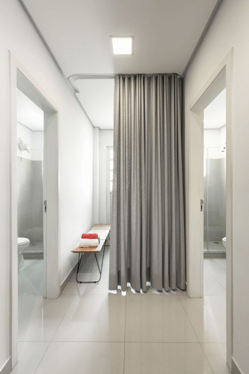 Como há apenas dois banheiros no imóvel, um vestiário foi criado entre eles com o uso de cortina, flexibilizando os espaços. Foi projetado um armário para junto do acesso principal da sala de treino. Ainda não executado, futuramente ele servirá de apoio para a recepção dos clientes. Pensado como um divisor permeável entre o acesso e o ambiente do treino, ele terá nichos para vegetação, guarda-chuvas, produtos à venda, marketing, etc.