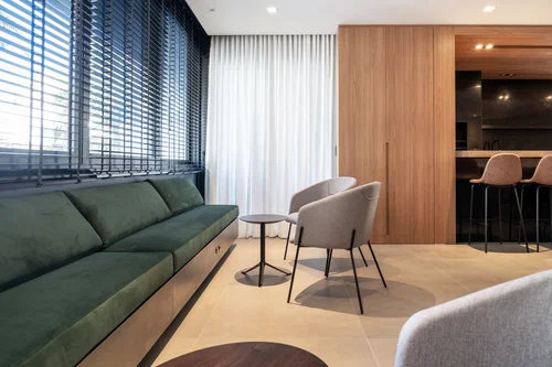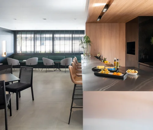 A partir do hall de entrada do edifício, painéis de madeira se fazem presentes criando zonas distintas em cada ambiente. No hall, a área relacionada à circulação, tanto horizontal (acessos) quanto vertical, recebeu forro rebaixado e painéis de madeira que criam um único volume, abrigando o armário de correspondências, elevador e a porta de serviços. Já no salão de festas, o volume de madeira, também composto por forro e painéis verticais, demarca a área da churrasqueira e abriga armários para casacos e para taças.