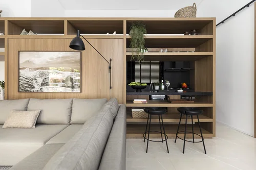 A nova marcenaria foi pensada com o intuito de integrar os ambientes e proporcionar mais opções de armários e gavetas. Seis metros de painel de Louro Freijó unificam o estar com a sacada fechada, além de garantir a organização dos aparelhos de som e de imagem em uma bancada baixa que acompanha toda a extensão do painel. Uma prateleira alta permite a colocação de plantas perto das janelas da sacada e a exposição de itens de decoração da família. Para a parede de divisa entre o jantar e a circulação íntima do apartamento, foi projetado um armário grande, porém neutro, e que dá o apoio necessário nas refeições. Uma porta de correr embutida no armário faz a separação dos ambientes, quando necessário, e proporciona uma maior otimização dos espaços e limpeza visual no ambiente.